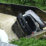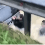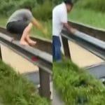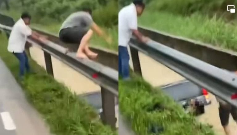 Dalam video berdurasi 14 saat tersebut, kelihatan seorang lelaki telah terjun dengan beraninya ke dalam longkang untuk menyelamatkan wanita yang sedang berpaut pada kenderaannya itu.