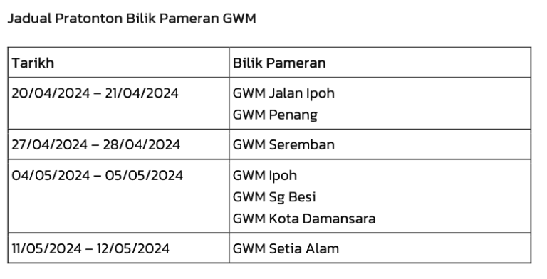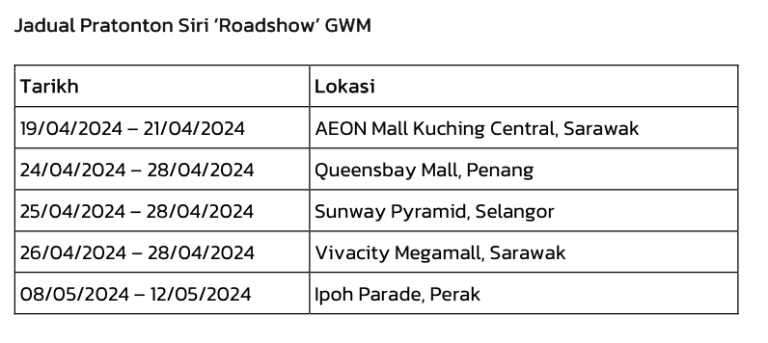 Bermula dari 19 April sehingga 12 Mei, siri jelajah Roadshow ini akan berlangsung di seluruh Malaysia. Orang ramai yang berminat boleh rujuk kepada jadual di bawah untuk menyaksikan sendiri model GWM Tank 300 ini.