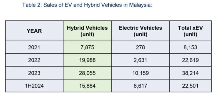 Bagi kenderaan hibrid pula, jumlah jualan untuk separuh pertama 2024 mencatatkan sebanyak 15,884 unit. Jika digabungkan bersama jumlah jualan EV, ia mencecah 22,501 unit setakat 6 bulan pertama 2024. Kenderaan hibrid juga menunjukkan peningkatan yang progresif pada setiap tahun iaitu 7,875 unit (2021), 19,988 unit (2022) dan 28,055 unit (2023).