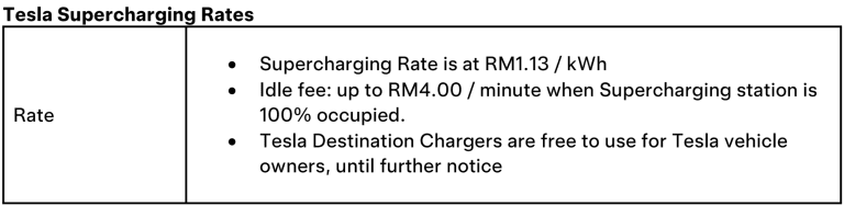 Dengan kadar harga sebanyak RM1.13/kWh, pengecasan Tesla kini menjadi salah satu cara pembayaran yang paling efisien di pasaran. Setakat hari ini, terdapat 14 stesen Supercharging dan 15 stesen Destination Charging di Malaysia yang menawarkan sejumlah 64 Supercharging dan 70 Destination Charging di bandar-bandar utama di Malaysia.