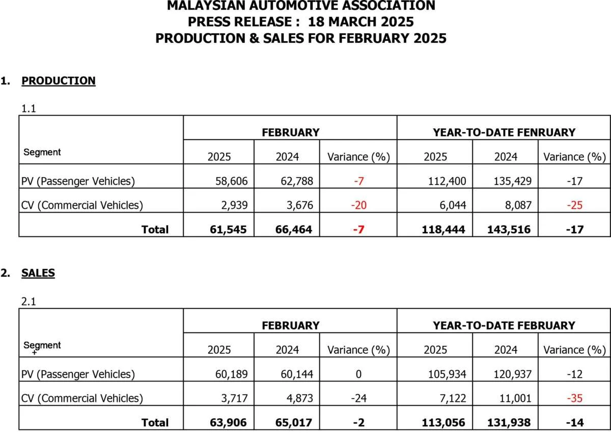 Setakat Februari 2025, jumlah jualan kenderaan telah mencapai 113,056 unit, 14% lebih rendah berbanding tempoh yang sama tahun lepas iaitu sebanyak 131,938 unit penghantaran.
