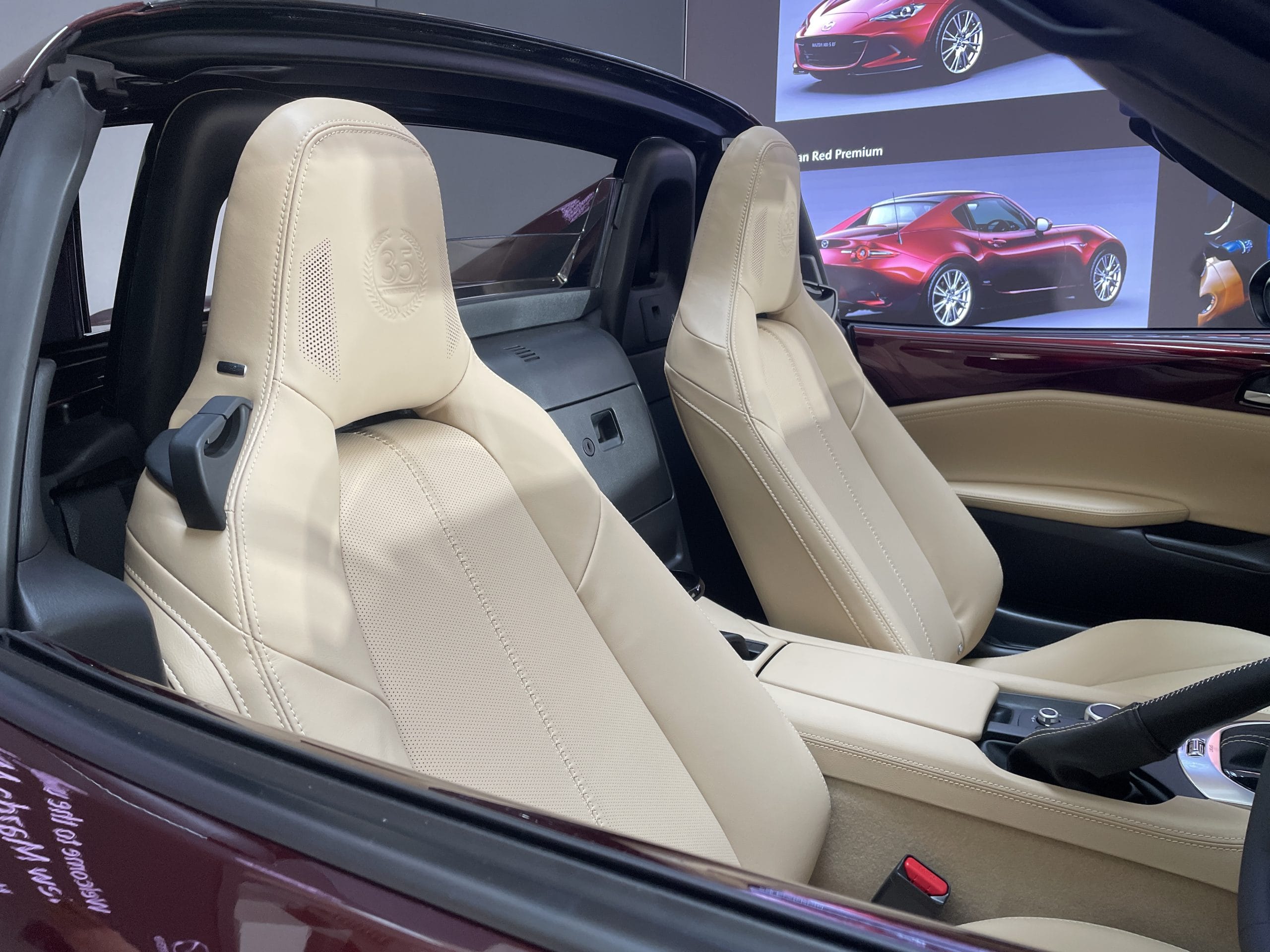 Di dalam, kereta ini mengekalkan gaya klasik kereta sport dengan tema dalaman Sports Tan. Bahagian papan pemuka, permaidani dan pelapik lantai menggunakan warna Tan yang sama. Logo Edisi Ulang Tahun ke-35 dijahit pada pelapik lantai dan timbul di bahagian kepala tempat duduk kulit. Warna Tan turut digunakan pada bahagian lubang udara dan panel pintu, sepadan dengan warna luar Artisan Red.
