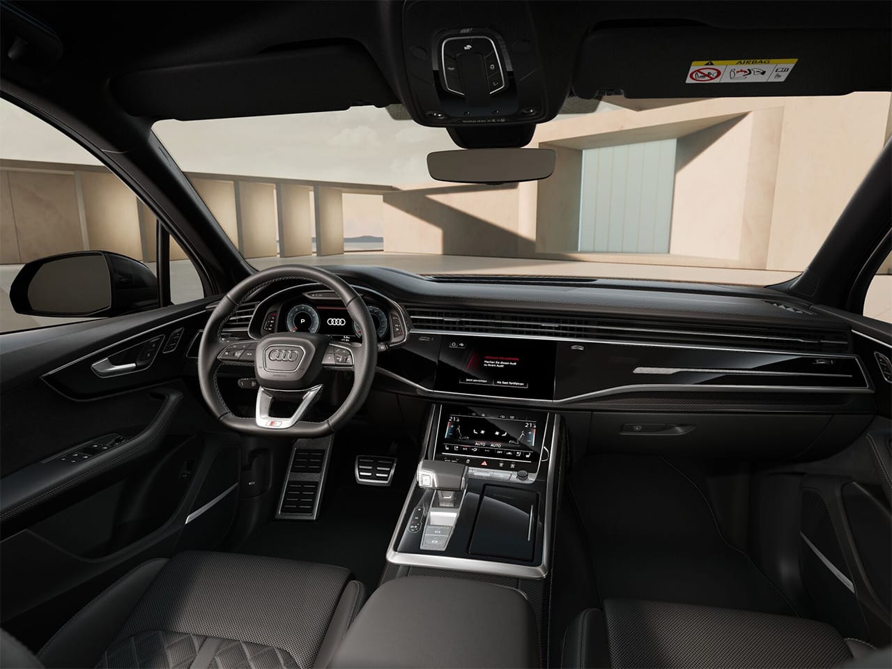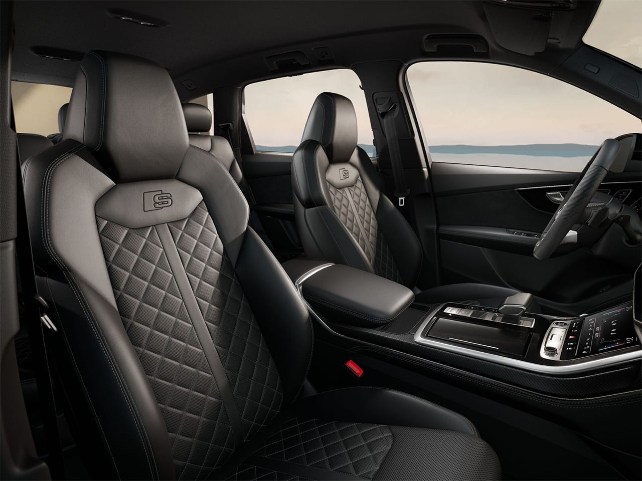 Bahagian dalaman menampilkan tempat duduk sukan kulit Valcona dengan logo S line, stereng kulit rata di bawah bersama paddle shifters, serta ambient lighting dengan 30 pilihan warna. Q7 mempunyai tujuh tempat duduk dan ruang dalaman yang luas dan fleksibel. Tempat duduk barisan kedua boleh dilaraskan untuk keselesaan, dan barisan ketiga boleh memuatkan dua penumpang dengan akses mudah melalui pelarasan barisan kedua.