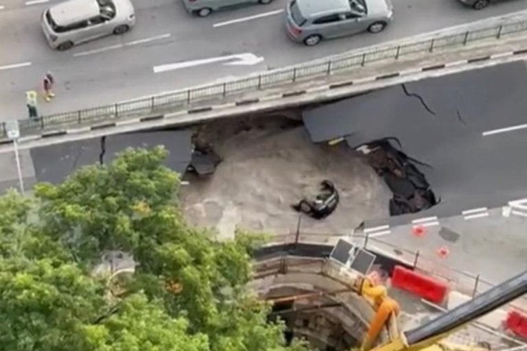 Gambar dan video yang tular di media sosial menunjukkan lubang besar di tepi jalan dengan air mengalir deras, serta sebuah kereta berwarna gelap sebahagiannya tenggelam. Tapak pembinaan kelihatan berhampiran.