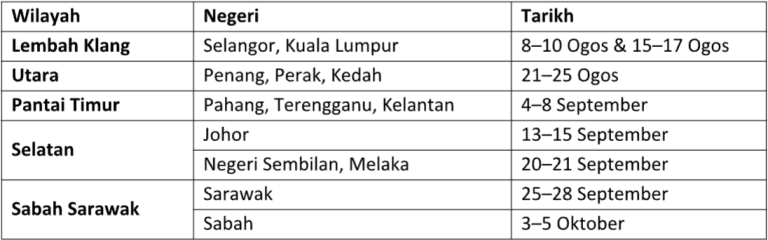 Berikut adalah tarikh dan lokasi yang telah dijadualkan: