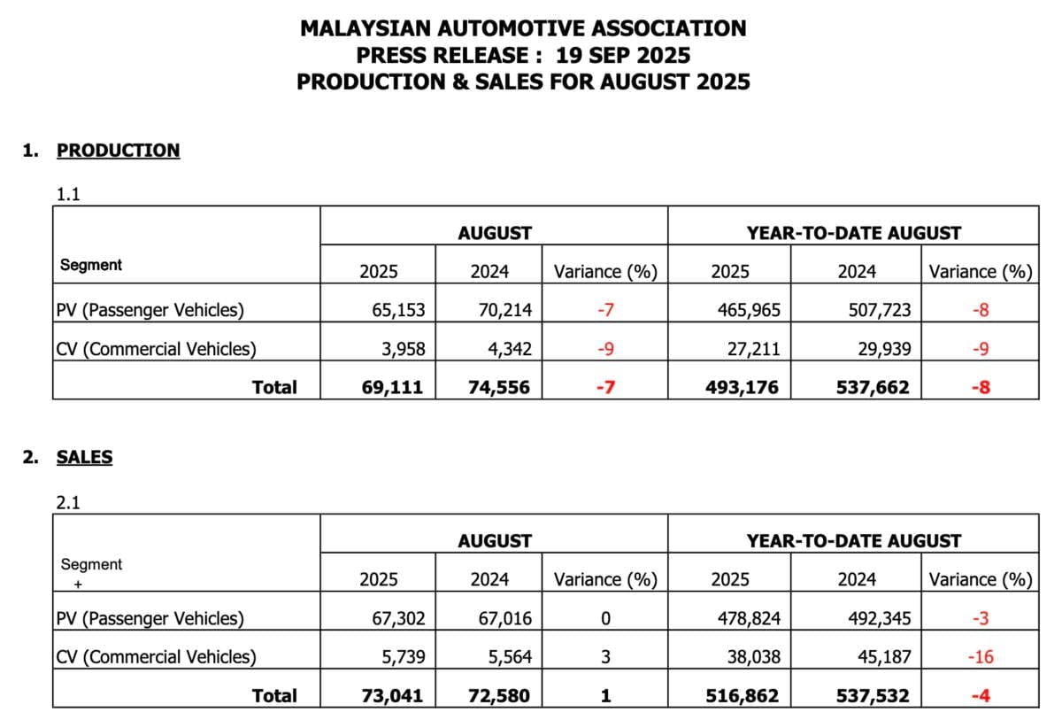 Setakat Ogos 2025, jumlah jualan kenderaan telah mencapai 516,862 unit, 4% lebih rendah berbanding tempoh yang sama tahun lepas iaitu sebanyak 537,532 unit penghantaran.