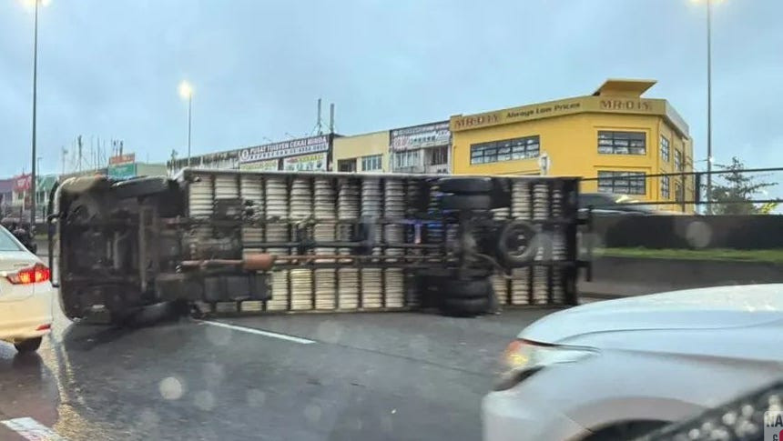 Berdasarkan situasi di lokasi, lori tersebut terbalik di atas jalan raya, menghalang hampir keseluruhan dua lorong dan memaksa pemandu memperlahankan kenderaan bagi mengelak halangan tersebut. Keadaan jalan yang licin dipercayai menjadi antara punca awal insiden berkenaan.